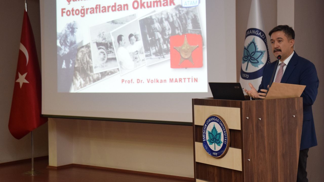 Prof. Dr. Volkan Marttin, konuşmasında Çanakkale Zaferi’nin Türk milletinin vatan sevgisini, fedakârlığını ve cesaretini gösteren kahramanlıklarla dolu olduğunu belirtti. Pek bilinmeyen fotoğraflar eşliğinde Osmanlı Devleti’nin savaşa girişini, seferberliğini, askerlerin talimlerini ve hazırlıklarını anlatan Marttin, "Ben vatan için çarpıştım, para için çarpışmadım" diyen Bigalı Mehmet Çavuş, Dardanos tabyasında birlikte şehit olan Hasan-Mevsuf, Rumeli Mecidiye tabyasında Yüzbaşı Mehmet Hilmi (Şanlıtop), Niğdeli Ali ve Koca Seyit’in kahramanlıklarını aktardı.