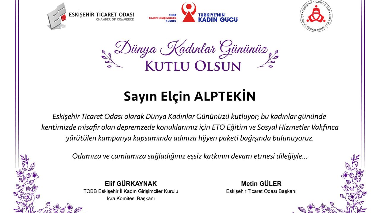 Adına bağış yapılan kadın girişimciler kurulu başkanlarına, meclis üyelerine ve ETO çalışanlarına, Eskişehir Ticaret Odası Başkanı Metin Güler ve TOBB Eskişehir İl Kadın Girişimciler Kurulu Başkanı Elif Gürkaynak tarafından bağış sertifikaları gönderildi.