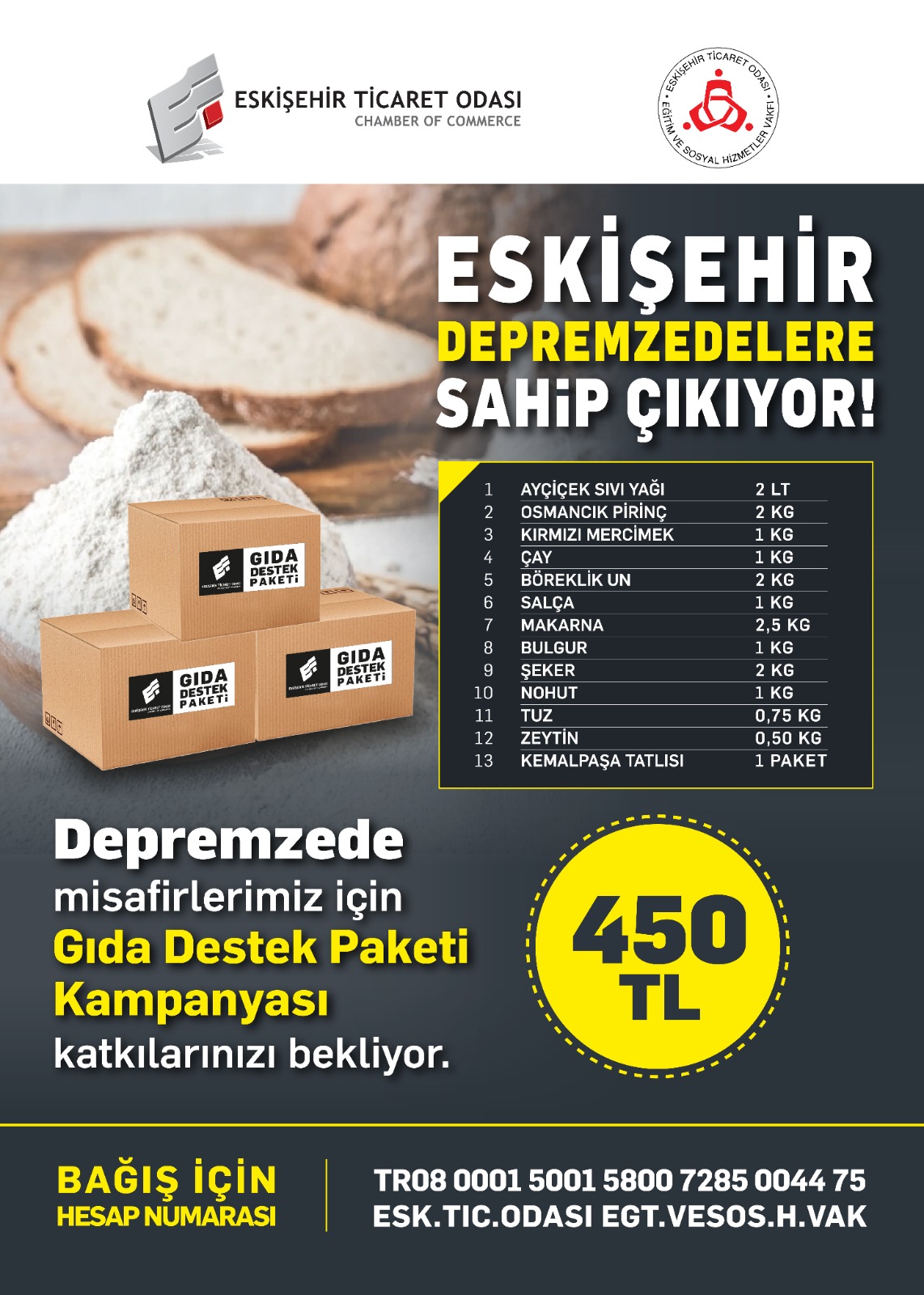 ETO üyeleri ESK.TIC.ODASI EGT.VESOS.H.VAK banka hesabından TR 08 0001 5001 5800 7285 0044 75 numaralı IBAN adresine yapacakları 450 lira karşılığında depremzedeler için gıda yardımında bulunabilecek.