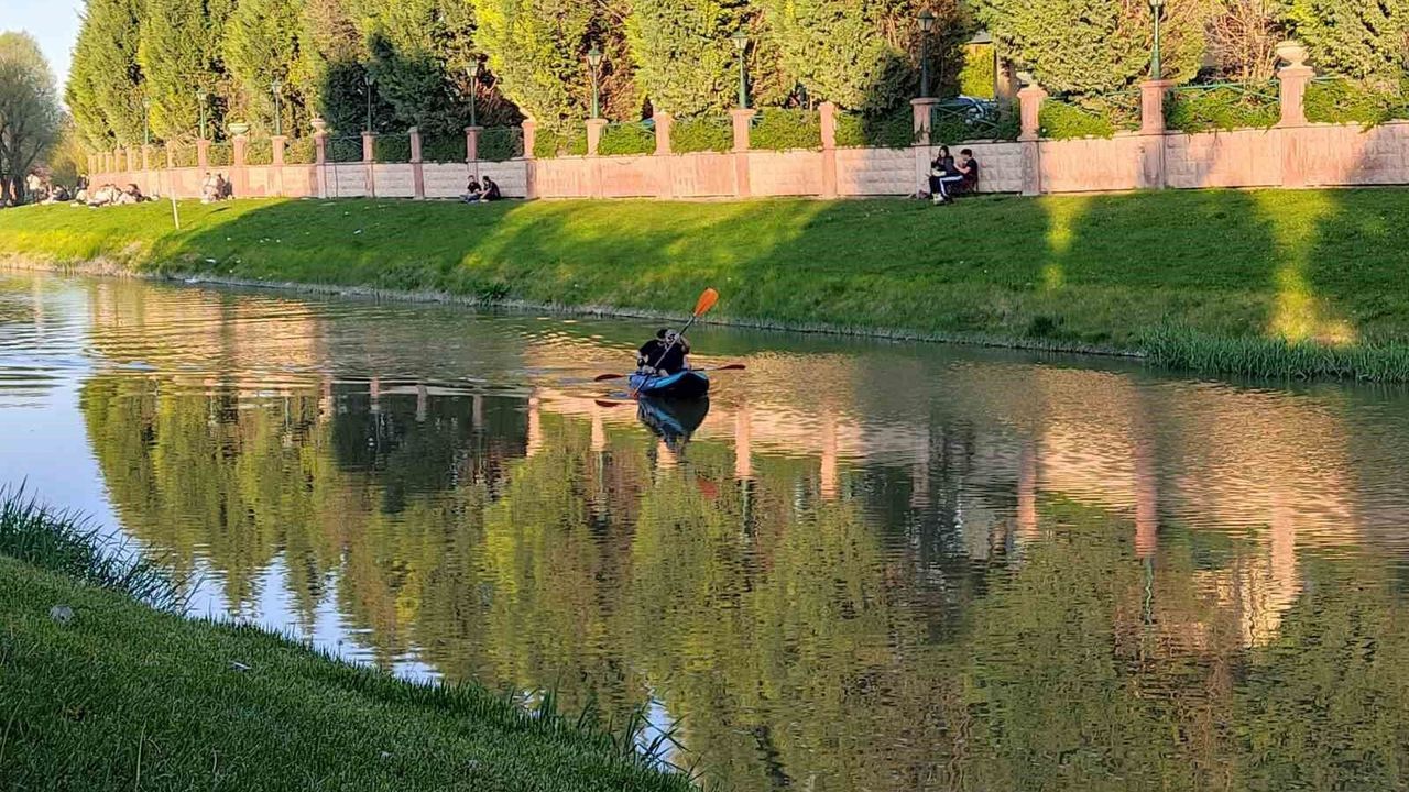Eskişehir'in yeşiliyle bilinen duraklarından biri olan Kanlıkavak Parkı'nda bir araya gelen gençler, Porsuk Çayı üzerinde kano yaparak güzel havanın tadını çıkardı.