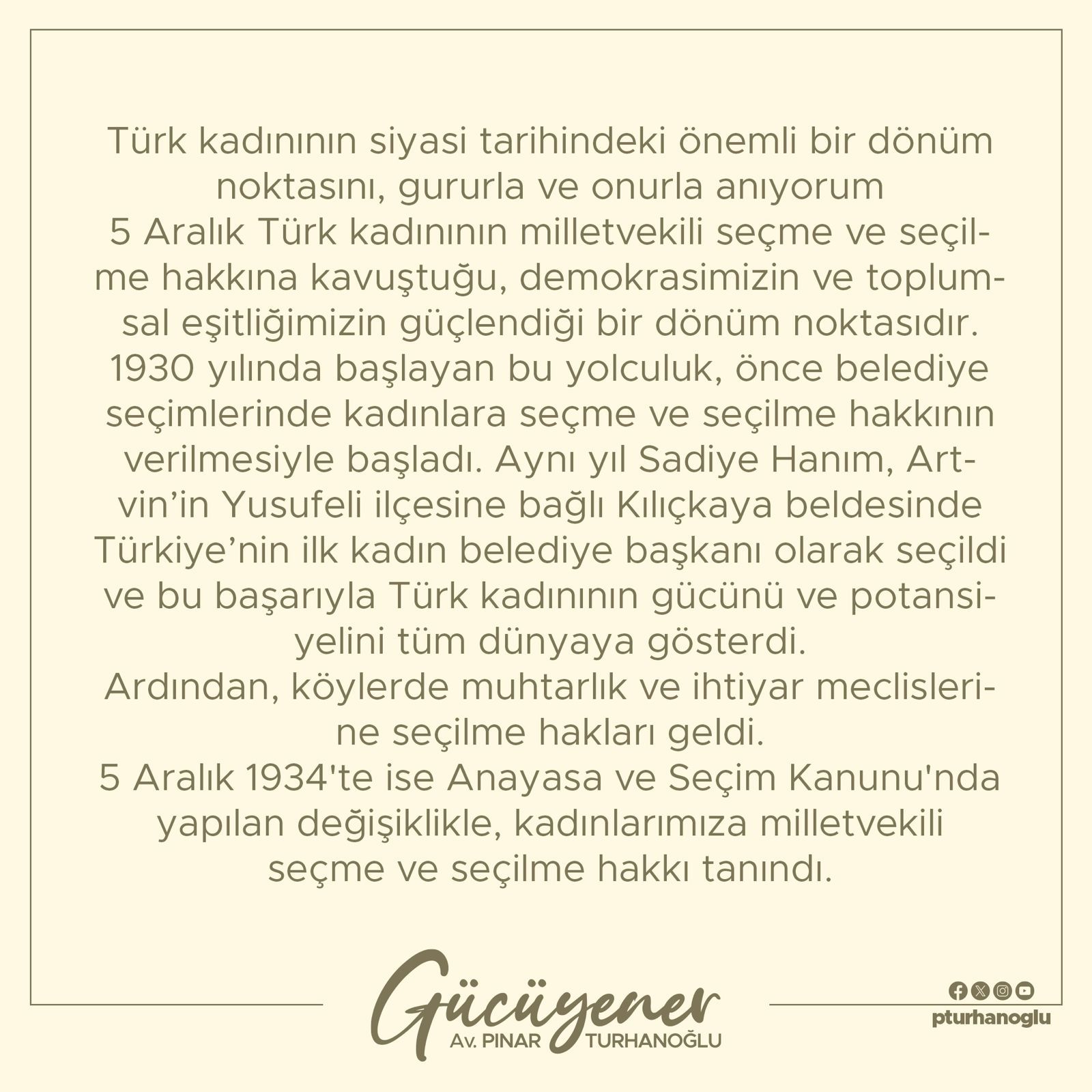 Av.Pınar Turhanoglu Gücüyener;1930 yılında başlayan bu yolculuk, önce belediye seçimlerinde kadınlara seçme ve seçilme hakkının verilmesiyle başladı. Aynı yıl Sadiye Hanım, Artvin’in Yusufeli ilçesine bağlı Kılıçkaya beldesinde Türkiye’nin ilk kadın belediye başkanı olarak seçildi ve bu başarıyla Türk kadınının gücünü ve potansiyelini tüm dünyaya gösterdi.