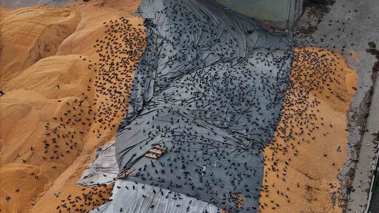 Eskişehir'de yüzlerce güvercinin istiflenen tonlarca hububat üzerine konup kalkarak karınlarını doyurma telaşı hoş manzaralar oluşturuyor. Dronla görüntülenen güvencinler nasiplerinin peşinde kanat çırparken, çevrede yaşayan vatandaşlar ise kuş pisliğinden dolayı evlerinin kirlendiğini belirterek şikayetlerini dile getiriyorlar.