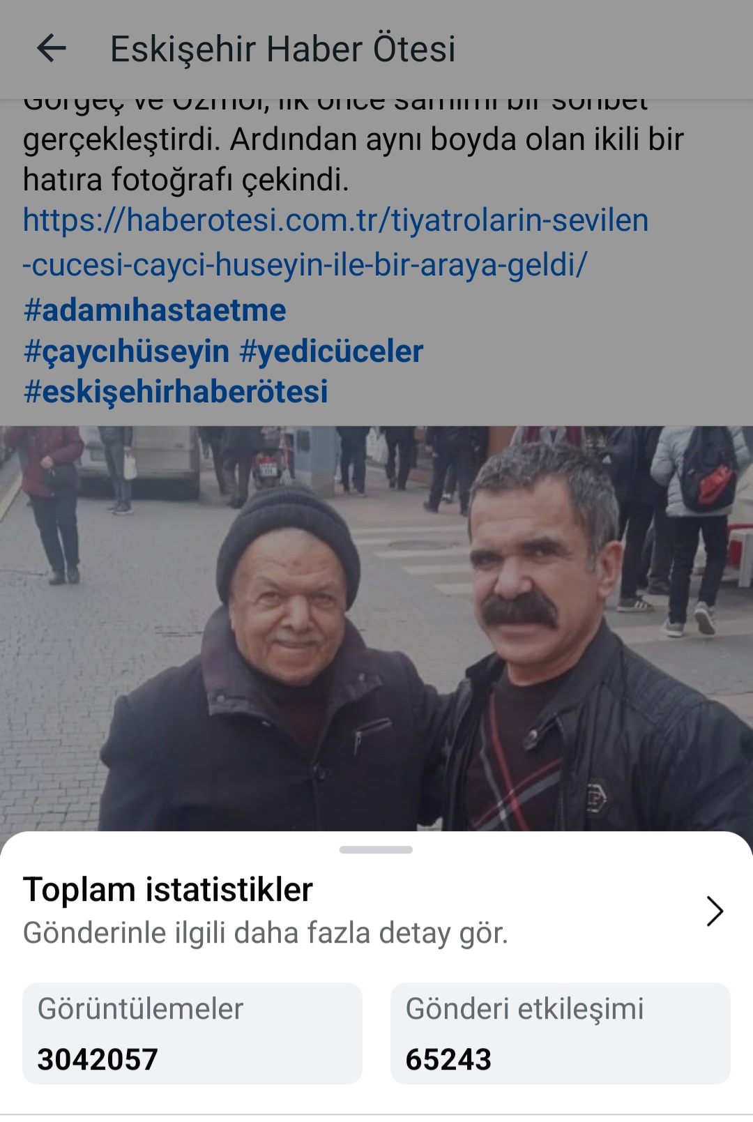 Eskişehir'in simgelerinden Yedi Cüceler'in kurucusu Erdal Görgeç ile " Çocuklar Duymasın " dizisinin Çaycı Hüseyin'i Alparslan Özmol'un İki Eylül Caddesi’nde tesadüf eseri karşılaşması sonrasında hatıra fotoğrafı çektirdigini anlatan haberimiz sosyal medya da 3 milyon 42 bin kez görüntülenme alarak bir rekora ulaştı