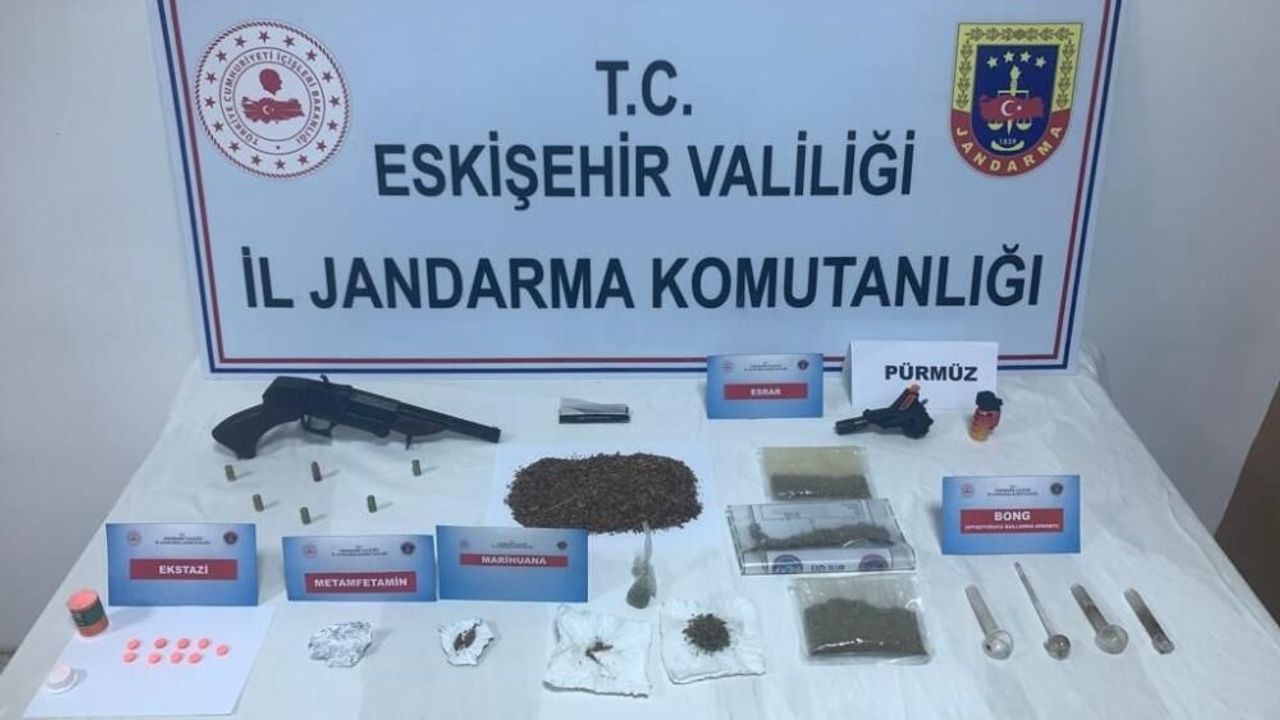Eskişehir İl Jandarma Komutanlığı Kaçakçılık ve Organize Suçlarla Mücadele Şube Müdürlüğü (KOM) ve Han İlçe Jandarma Komutanlığı ekiplerinin şüpheli şahısların üzerinde, ikametinde ve aracında yaptığı aramada 1 adet tabanca, 6 adet tabanca fişeği, 4 adet uyuşturucu kullanma aparatı (PAYP), 1 gram metamfetamin, 505 gram esrar karışımlı tütün, 285 gram kubar esrar, 1 adet uyuşturucu içiminde kullanılan pürmüz ve çakmağı, 1 gram marihuana, 9 adet uyuşturucu hap (extazi) ele geçirildi. Cumhuriyet Savcısının talimatıyla şüpheli şahıslar hakkında “Uyuşturucu İmal ve Ticareti” ve “Uyuşturucu ve Uyarıcı Madde Kullanımı” suçundan adli işlem başlatıldı.