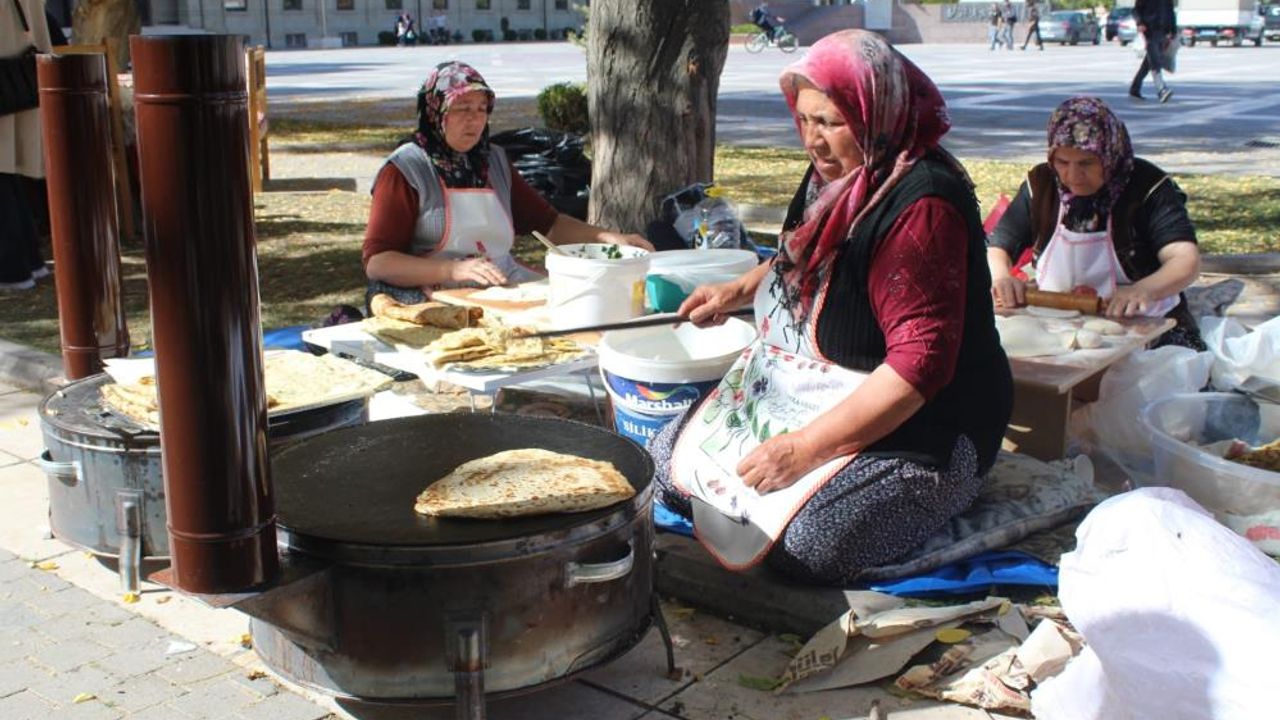 Eskişehir’in Han ilçesinde yaşayan köylü kadınların tamamen ev yapımı birden fazla çeşit yemekleri vatandaşların beğenisini sunuldu. Valilik Meydanı’nda kurulan stantlarda peynirli, patatesli ve ıspanaklı gözlemeler, bazlamalar ile birlikte tarhana, bulgur gibi bakliyatlar Eskişehirliler tarafından ilgi görüyor. Ev yapımı yiyeceklerini satan köylü kadınlar kendi ekonomilerine de katkı sağlıyor. Han ilçesinin Gökçekuyu Mahallesi’nden ev yapımı yemeklerini satmak için gelen Kezban Kurnaz, tüm ürünlere vatandaşların rağbet gösterdiğini belirtti.