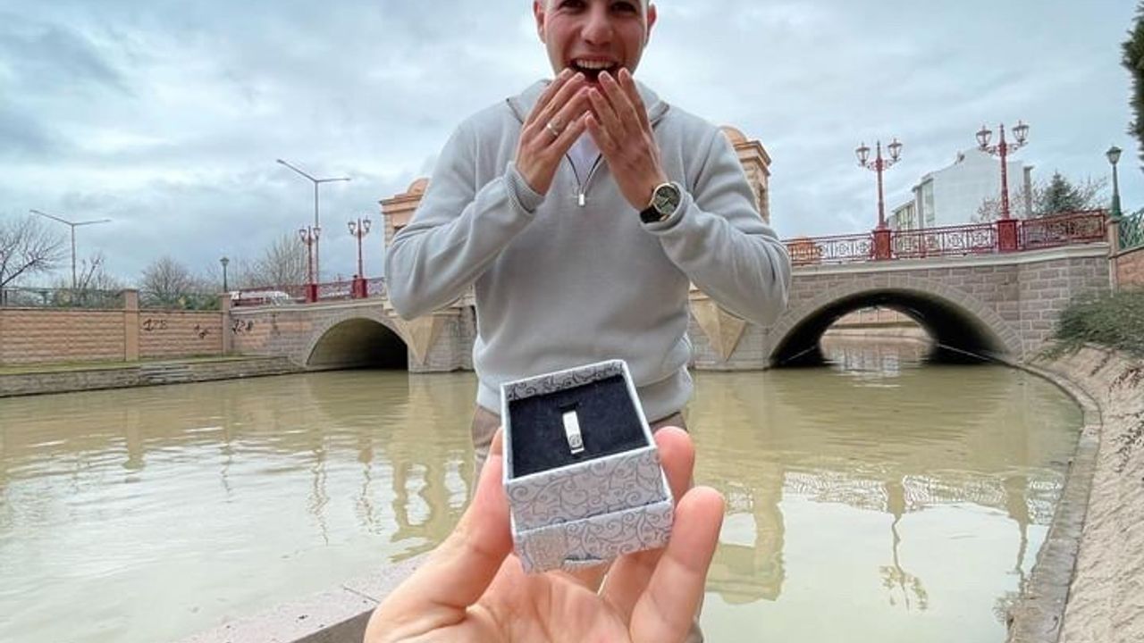 Eskişehir’de fotoğraf çekinme bahanesiyle erkek arkadaşını Porsuk Çayı kenarına davet eden Sena Özer, diz çöküp harçlıklarıyla aldığı yüzükle evlilik teklifi etti.