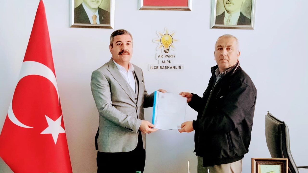 31 Mart Yerel seçimleri öncesi siyasi Partilere Aday adaylığı başvuruları devam ediyor.uzun Zamandır.AK Parti'den Alpu Belediye Başkan Adaylığı için çalışmalar yürüten Makine Yüksek Mühendisi Hasan Ay AK Parti Alpu ilçe Başkanlığına başvurusunu yaptı.