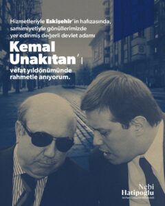 Kemal Unakıtan 'ın Eskişehir Milletvekili ve Maliye Bakanı olduğu dönemde Eskişehirspor Başkanı olan Hatipoğlu; Hizmetleriyle Eskişehir’in gönlünde iz bırakmış, tevazusuyla ve samimiyetiyle hep hatırlanan değerli devlet adamı, eski Maliye Bakanımız Kemal Unakıtan’ı vefatının yıldönümünde rahmet, minnet ve dualarla anıyorum.