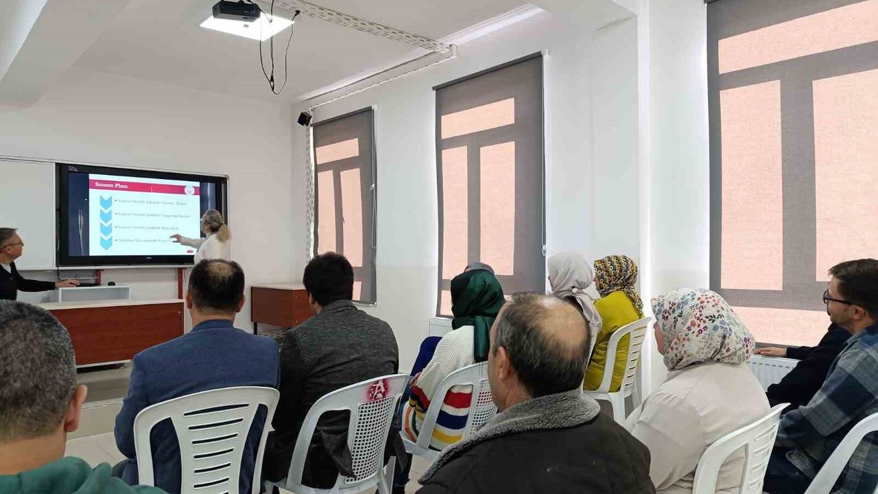 Atatürk İlkokulunda öğretmen ve okul personeline yönelik Sınıf Öğretmeni Semra Bülbül tarafından verilen, “Kadına Yönelik Şiddetle Mücadele” konulu seminerde, şiddetin tanımı ve türleri, şiddet döngüsü ve şiddeti önleme mekanizmaları konularında bilgiler verildi.