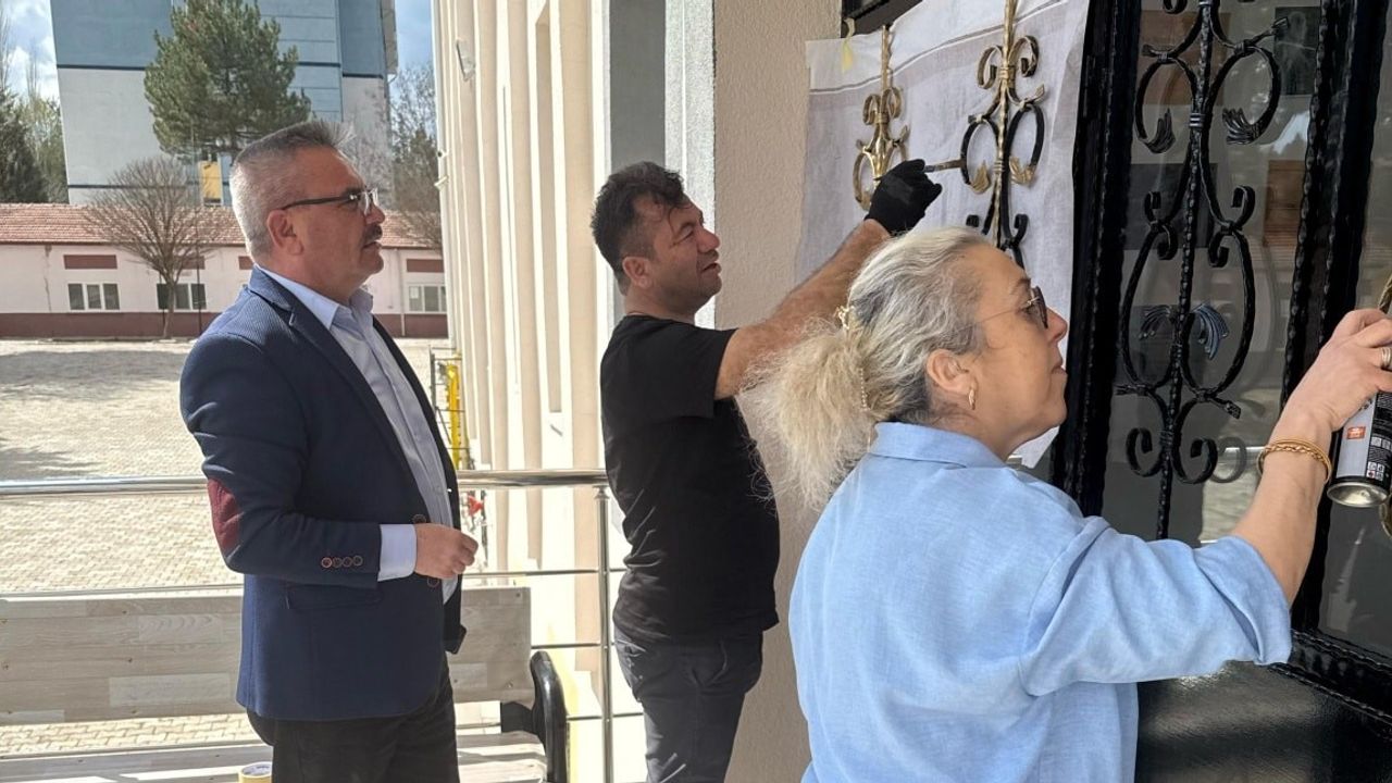 163 öğrencinin öğrenim gördüğü Atatürk İlkokulunda müdür, müdür yardımcısı ve öğretmenler ellerine aldıkları fırça ve sprey boya ile boyası yıpranan okulun dış giriş kapısını ders saatleri dışında boyadılar.