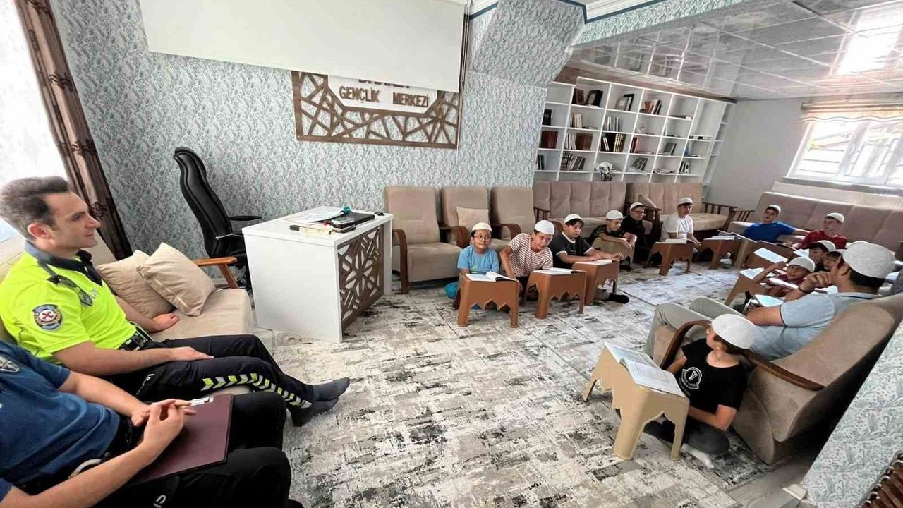 İlçe Emniyet Amirliğinde görevli trafik polisleri tarafından kursa katılan 17 öğrenciye, trafik kuralları, kask kullanımının hayati rolü, ehliyetsiz araç kullanmanın tehlikeleri, sürücülerin ve yayaların uyması gereken kurallar, yaya geçidi ve trafik ışıkları hakkında bilgilendirmelerde bulunuldu.