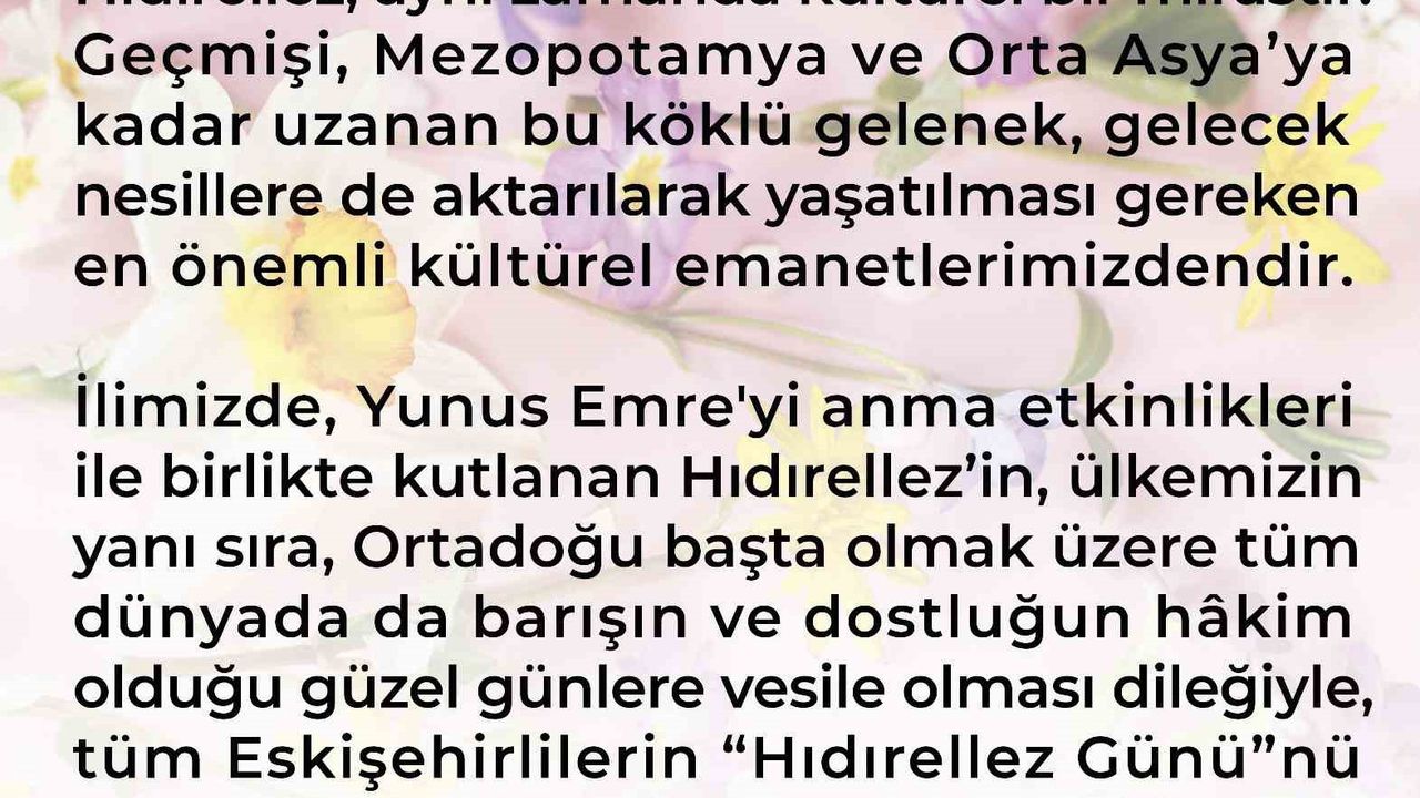"Birçok kültürde yüzyıllardır kutlana gelen Hıdırellez, aynı zamanda kültürel bir mirastır. Geçmişi, Mezopotamya ve Orta Asya’ya kadar uzanan bu köklü gelenek, gelecek nesillere de aktarılarak yaşatılması gereken en önemli kültürel emanetlerimizdendir. İlimizde, Yunus Emre’yi anma etkinlikleri ile birlikte kutlanan Hıdırellez’in, ülkemizin yanı sıra, Orta Doğu başta olmak üzere tüm dünyada da barışın ve dostluğun hâkim olduğu güzel günlere vesile olması dileğiyle, tüm Eskişehirlilerin ’Hıdırellez Günü’nü kutluyor, sağlıklı ve huzurlu günler diliyorum."