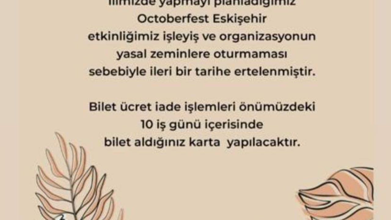 Eskişehir Valiliği tarafından alınan karar gereği içki festivali iptal edildi. Umuma açık yerlerde çocuklarımıza ve gençlerimize olumsuz örnekler teşkil edecek böylesi bir duruma müsaade etmediği için Eskişehir Valimiz Hüseyin Aksoy’a konuya olan duyarlılığı için teşekkür ederiz ifadelerini kullandı