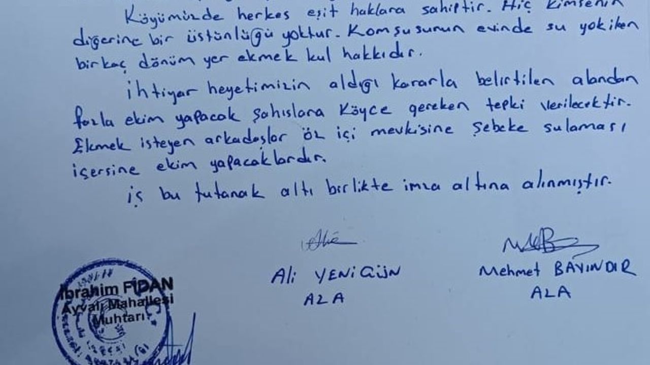 "Ülkemizde son yıllarda kuraklık yaşanmaktadır. Yaz aylarının gelmesi nedeniyle köyümüzde üç, dört ay su sıkıntısı beklenmektedir. Bu nedenlerden dolayı köy ihtiyar heyetinin aldığı kararla, bahçe ekeceklerin 50 metrekareden fazla ekim yapmaları yasaklanmıştır. Peygamber Efendimiz (SAV) "Müslüman susamış bir Müslümana su verirse, Allah da ona içerisinde güzel kokular olan cennet içeceği içirir" buyurmaktadır. Köyümüzde herkes eşit haklara sahiptir. Hiç kimsenin diğerine bir üstünlüğü yoktur. Komşusunun evinde su yokken birkaç dönüm yer ekmek kul hakkıdır. İhtiyar heyetimizin aldığı kararla, belirtilen alandan fazla ekim yapacak şahıslara köyce gereken tepki verilecektir. Ekim yapmak isteyen arkadaşlar, Öz İçi mevkiine şebeke sulaması içerisine ekim yapacaklardır."