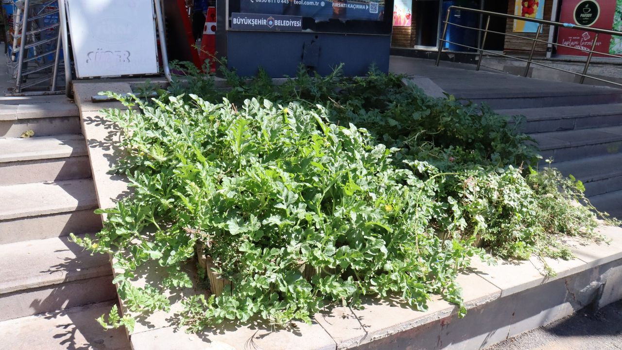Eskişehir’de bir sokakta iki merdiven arasına kimliği belirsiz kişi ya da kişiler tarafından atılan karpuz çekirdekleri yeşerip meyve verdi.