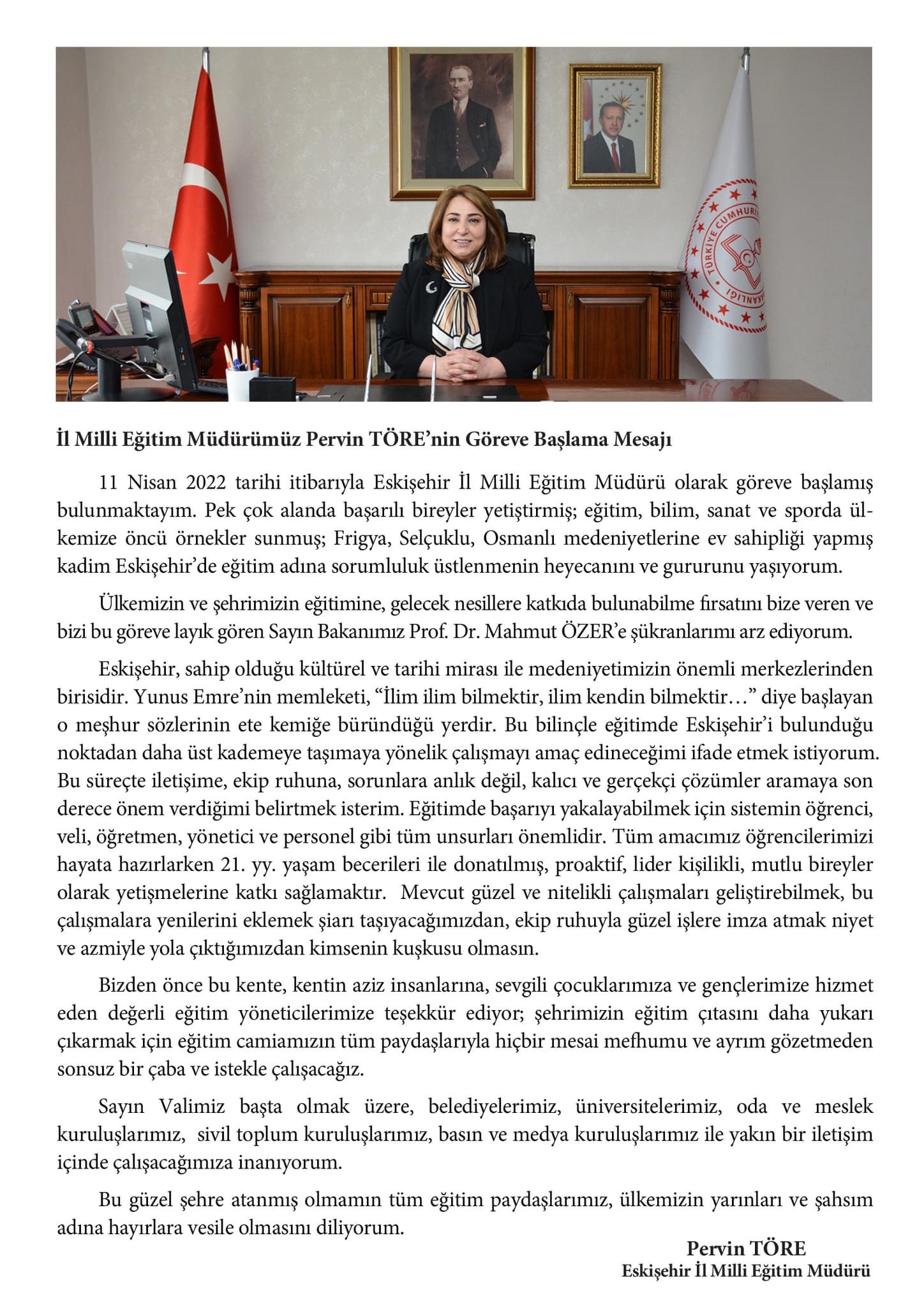 Eskişehir’de yeni göreve başlayan İl Milli Eğitim Müdürümüz Pervin Töre, göreve başlama mesajı yayımladı.