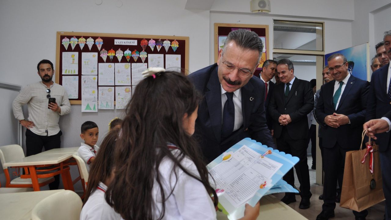 Eskişehir'de bir grup ilkokul öğrencilerine karnelerini veren Vali Hüseyin Aksoy, çocuklara hediyeler armağan ederek yaz tatilinde kitap okumalarını tavsiye etti.