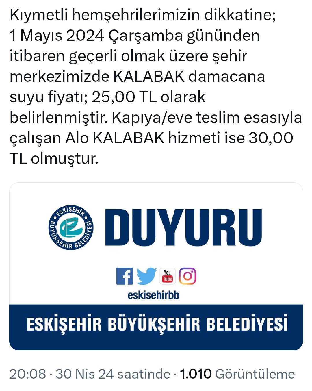 1 Mayıs 2024 Çarşamba gününden itibaren geçerli olmak üzere şehir merkezimizde KALABAK damacana suyu fiyatı; 25,00 TL olarak belirlenmiştir. Kapıya/eve teslim esasıyla çalışan Alo KALABAK hizmeti ise 30,00 TL olmuştur denildi.
