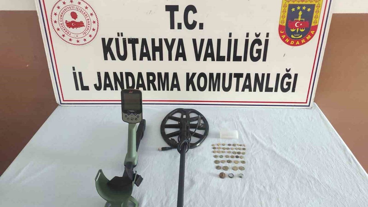 Kütahya İl Jandarma Komutanlığı ekiplerince Gediz İlçesi Yenikent Beldesi Gölcük Mahallesinde M.V. (35) isimli şahsın evinde yapılan aramada, 38 adet eski madeni para, 3 adet yüzük ve 1 adet detektör ele geçirildi.