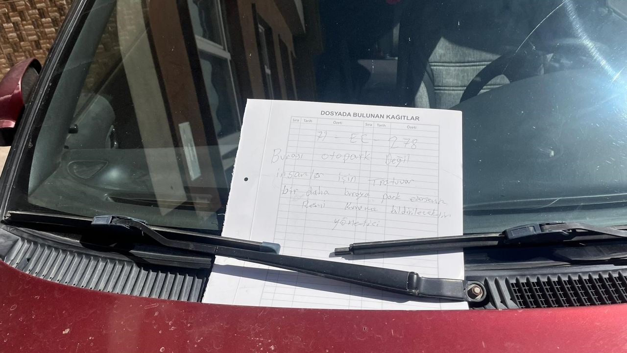 Notta, "71 EC 278 Burası otopark değil, insanlar için tretuvar. Bir daha buraya park ederseniz resmi kuruma bildirilecektir. Yönetici." ifadeleri yer aldı.