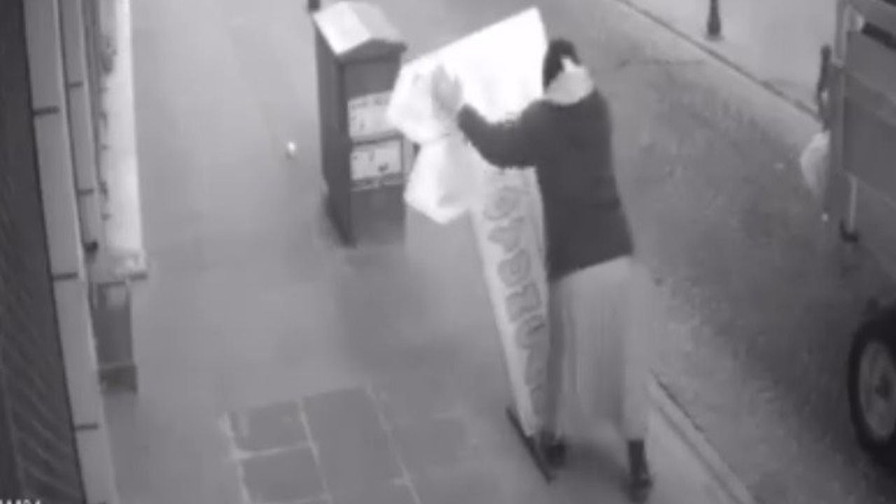 Geçtiğimiz günlerde sabah saatlerinde Deliklitaş Mahallesi Gürman Sokak’ta bulunan iş yerini açan Burak Kaban, kapısının önündeki kaldırıma vidaladığı tabelasının olmadığını fark etti. Güvenlik kameralarını kontrol ettiğinde hayatının şokunu yaşayan Kaban, tabelanın geri dönüşüm malzemesi toplayan bir kadın tarafından sökülerek götürüldüğünü gördü. Dükkanının önüne 4 vida ile sabitlediği tabelasının bir kadın tarafından herhangi bir alet kullanılmadan sökülmesinin şaşırtıcı olduğunu belirten Burak Kaban, “Normalde 4 ayağından da sağlamca vidalamışız. Ona rağmen kadın gücüyle çıkartabildi” dedi.