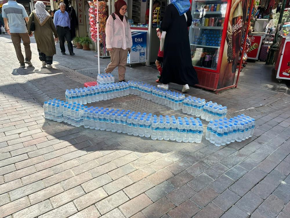 Çoğu zaman kalabalık olduğu bilinen bölgede vatandaşların ıslak betona basmaması için önlem alan esnaf, onardığı yeri su şişeleriyle çevreledi. Aldığı önlemle ilginç görüntüye neden olan işletme, yoldan geçen vatandaşların dikkatini topladı.