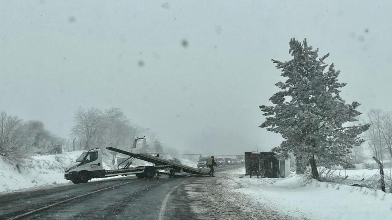 Kar yağışının etkili olduğu Domaniç-İnegöl yolu Kocayayla Orman Deposu yakınlarında bir ticari araç, sürücüsünün kontrolünü kaybetmesi sonucu devrildi. Kazanın ardından olay yerine yönlendirilen ekipler, bölgedeki trafiğin güvenliğini sağladı.