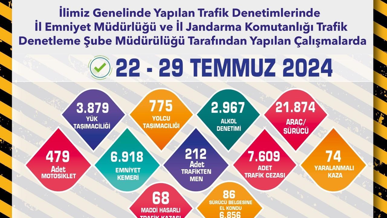 İl Emniyet Müdürlüğü’ne ve İl Jandarma Komutanlığı’na bağlı ekipler tarafından 22 Temmuz ile 29 Temmuz tarihleri arasında kent genelinde trafik denetimi gerçekleştirildi. Denetimlerde, 22 bin 353 araç kontrol edilirken, trafik kurallarına uymadığı belirlenen 7 bin 609 araca ve sürücüsüne trafik cezası kesildi.