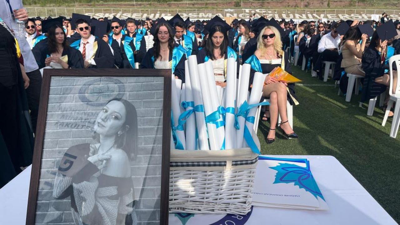 Eskişehir Osmangazi Üniversitesi Meşelik Kampüsü'nde kezuniyet töreni düzenlendi. Kahramanmaraş'taki evinde ailesiyle birlikte 6 Şubat depremlerinde enkazın altında kalarak hayatını kaybeden Mühendislik ve Mimarlık Fakültesi öğrencisi 21 yaşındaki Begüm Sarıyıldız da törende unutulmadı.