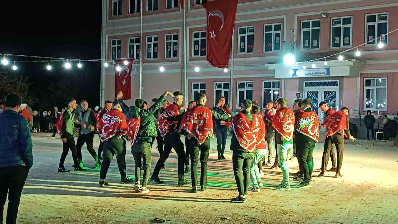 Mahmut Köy Ortaokulu bahçesinde düzenlenen asker eğlencesine Mahmut Köyü Muhtarı Mehmet Kuzu, asker adaylarının aileleri, köy sakinleri ve çok sayıda asker adayı katıldı. Eğlencede, omuzlarına ay yıldızlı şal takan asker adaylarına anneleri tarafından kına yakıldı. Kına merasimi esnasında bir taraftan gençler halay çekip eğlenirken aileler ise duygulu anlar yaşadı. Müzik eşliğinde doyasıya eğlenen gençler, vatani görevlerini yerine getirmeden önce moral buldu.