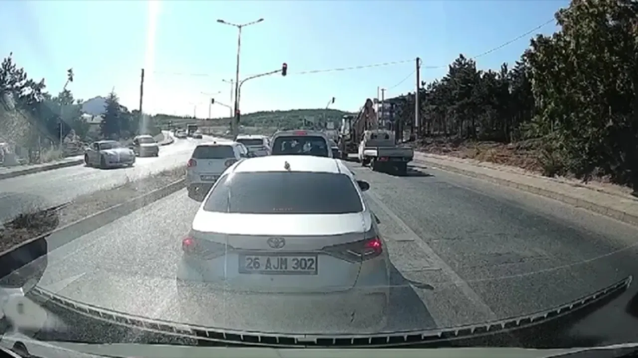 Eskişehir'de kırmızı ışık yanmasına rağmen hız kesmeyen lüks otomobilin kazaya neden olduğu ve olay yerinden kaçtığı anlar bir araç kamerasıyla saniye saniye kayıt altına alındı.
