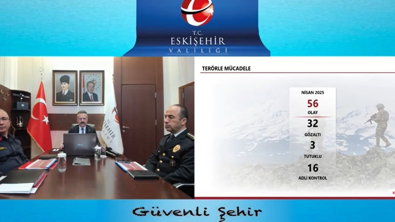 Eskişehir Valisi Hüseyin Aksoy, 'Güvenlik Bilgilendirme Toplantısı'nda açıklamalarda bulundu. Valiliğin sosyal medya hesaplarından canlı olarak yayınlanan toplantıda Vali Aksoy, nisan ayında Eskişehir'de gerçekleştirilen operasyonlar ve yapılan çalışmalarla ilgili vatandaşları bilgilendirdi. İl Emniyet Müdürü Tolga Yılmaz ve İl Jandarma Komutanı Tuğgeneral Erhan Demir, toplantı boyunca Vali Aksoy'a eşlik etti.