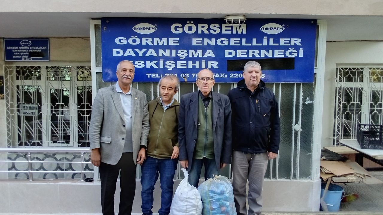 Eskişehir’de bulunan Köy Kültür Evi'nin kurucusu Mehmet Ali Baysak, topladığı 2 çuval mavi kapağı Görme Engelliler Dayanışma Derneği'ne (GÖRSEM) teslim etti.