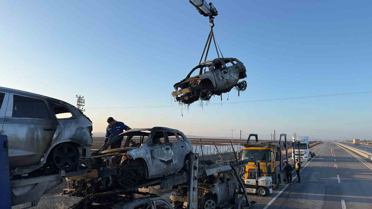 Çifteler-Emirdağ arasındaki karayolunda seyir eden BMW marka lüks suv ve binek araçların bulunduğu tırda çıkan yangın sonrası sıfır kilometre otomobiller yanarak hurdaya döndü.