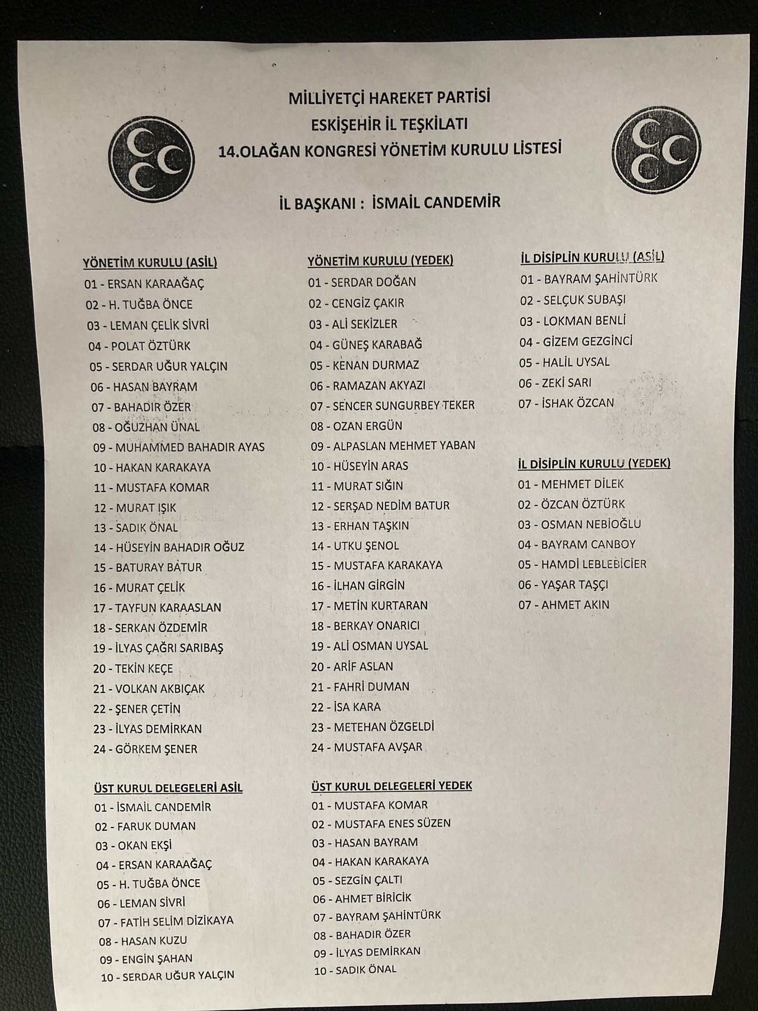 2018 den bu yana MHP il Başkanlığı görevini yürüten İsmail Candemir'in listesinde Milletvekili adayları Leman Sivri, Bahadır Ayas, Oğuzhan Ünal ile önceki dönem Odunpazarı ilçe Başkanı Mustafa Komar da bulunuyor.
