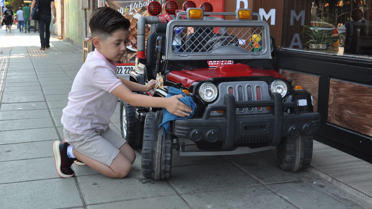 Babasından özenerek küçük yaşta araçlara ilgi duymaya başlayan 6 yaşındaki Arda Ayan, 2021 yılında kendisine alınan akülü aracına adeta gözü bakıyor. Yaz mevsiminin de gelmesiyle haftanın 3 günü düzenli olarak aracını temizleyen minik Arda, yoldan geçen vatandaşların ilgi odağı. Akülü aracını temizlerken müzik açmayı da ihmal etmeyen minik araba sever, işlerini tamamladıktan sonra köpeğiyle birlikte tur atıyor. Çevre esnafının neşesi haline gelen Ayan, araç temizliği konusunda zaman zaman babasına da yardım ediyor.