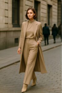 Üç parçalık bir kombin düşünün: aynı renkte bir pantolon, bluz ve ceket. Üstüne aynı tonlarda çanta ve ayakkabı. Ve işte sonuç: Disiplinli, sade, özenli. Bir bakışta güven veren, iş hayatının ciddiyetini yansıtan ama aynı zamanda ince bir zarafet taşıyan bir görünüm.