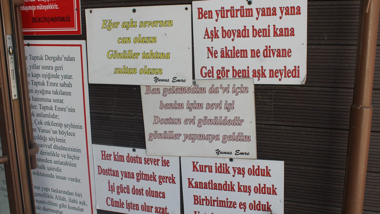 Eskişehir Odunpazarı ilçesi Deliklitaş Mahallesi Muhtarı Hüsnü Petek, muhtarlık ofisinin duvarına astığı Yunus Emre’nin özlü sözleriyle vatandaşların takdirini alıyor. 79 yaşındaki muhtar Petek, Eskişehirli olan Yunus Emre’ye sevgisini onun değerli özlü sözlerini asarak gösteriyor. Muhtarlık önünden geçen vatandaşlar da duvardaki özlü sözleri okuyarak ufuklarını genişletiyor.