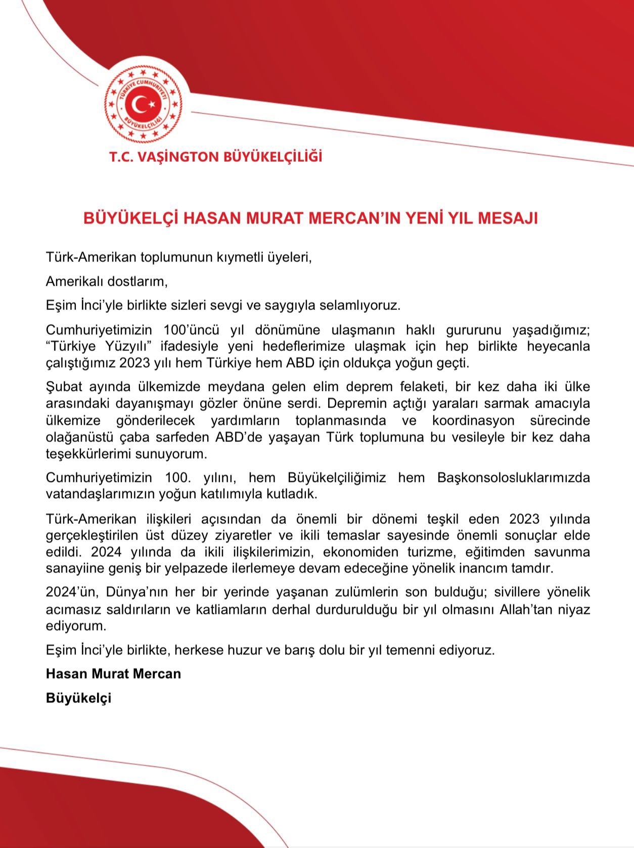 Türkiye Cumhuriyeti'nin Washington Büyükelçisi ,22 ve 23. dönem Eskişehir Milletvekili Hasan Murat Mercan Yeni yıl dolayısıyla bir kutlama mesajı yayınladı.