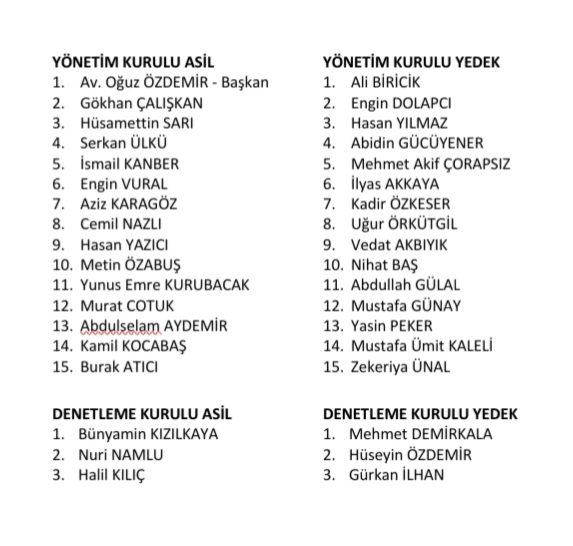 Tek liste halinde gidilen seçim sonucunda Yönetim Kurulu şu isimlerden oluştu