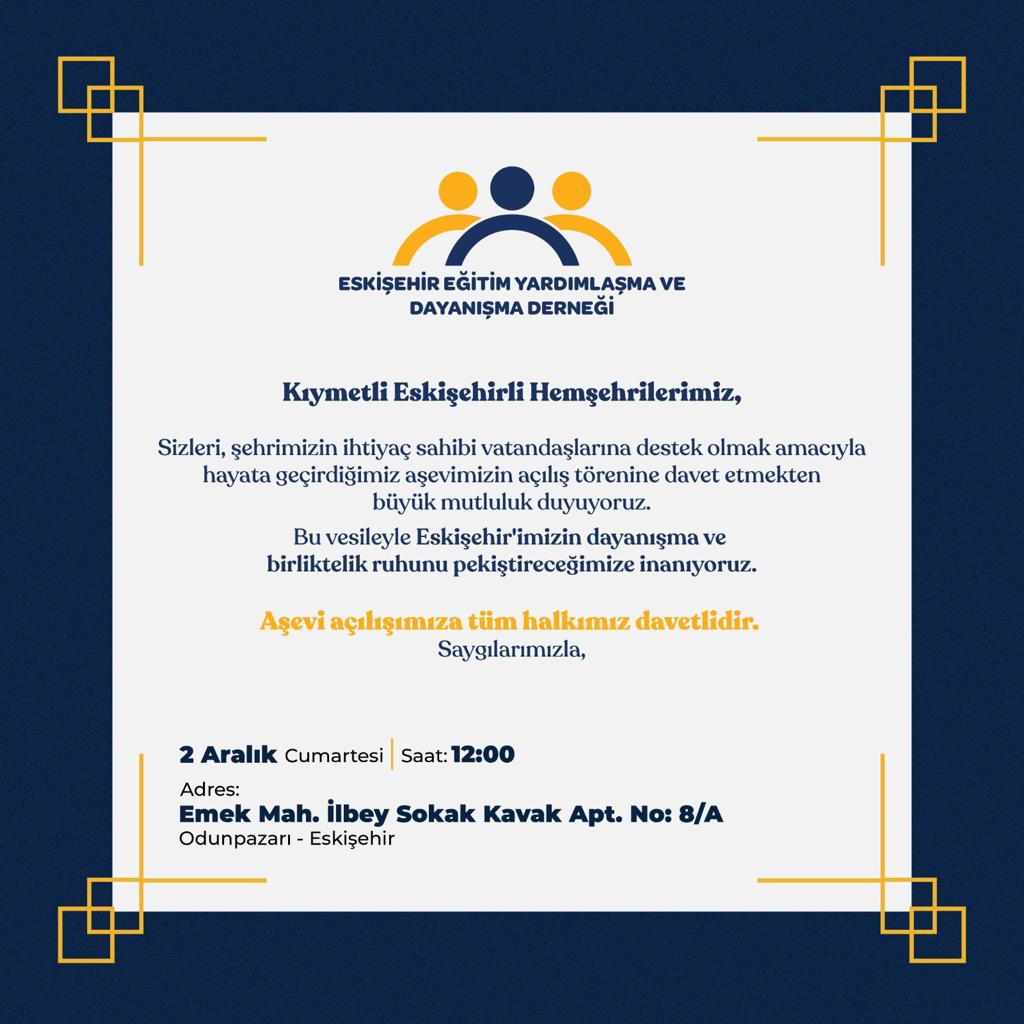 Konuyla ilgili yapılan açıklamada, Eskişehirliler açılışa davet edilerek, “Şehrimizin ihtiyaç sahibi vatandaşlarına destek olmak amacıyla hayata geçirilen aşevinin açılış törenine davet etmekten büyük mutluluk duyuyoruz. Bu vesileyle Eskişehir’imizin dayanışma ve birliktelik ruhunu pekiştireceğimize inanıyoruz” denildi.