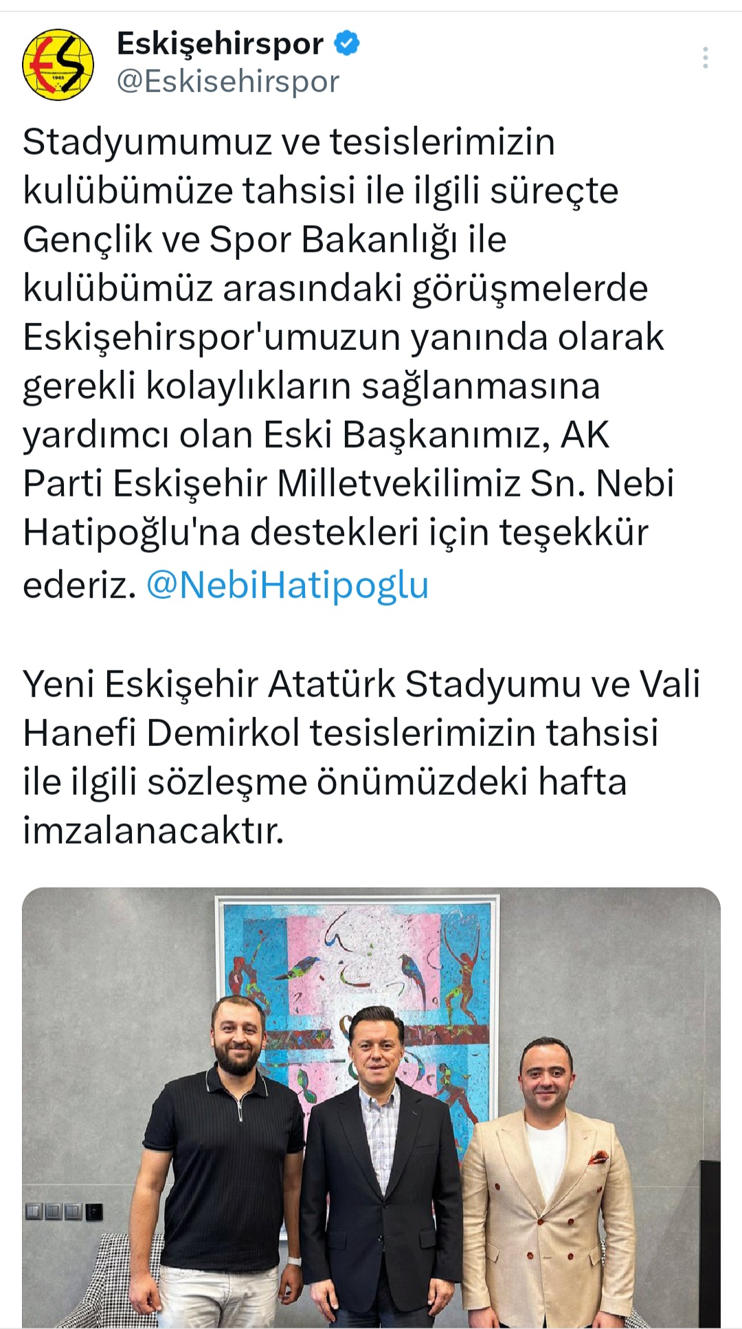 AK Parti Eskişehir Milletvekili Nebi Hatipoğlu: “Eskişehir Atatürk Stadyumu ve Vali Hanefi Demirkol Tesisleri'nin Eskişehirspor'umuza tahsisi konusunda, Gençlik ve Spor Bakanlığımız ile anlaşma sağlandı.