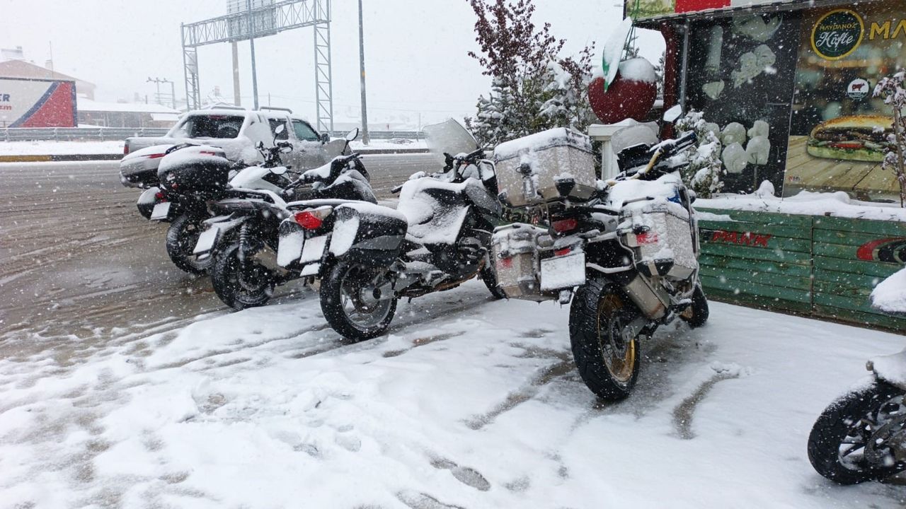 Eskişehir’den sabah saat 07.00’de Antalya’nın Manavgat ilçesine gitmek üzere yola çıkan 12 motosikletli vatandaş, Afyonkarahisar’da kar ve tipiye yakalandı. Eksi 3 derecelik havada ve kaygan zeminde sürüş gerçekleştiremeyen grup, önce bir dinlenme tesisinde dinlenerek havanın yumuşamasını bekledi. Ancak kar yağışının giderek şiddetini artırmasından dolayı 12 kişilik motosikletli grup dinlenme tesisinde mahsur kaldı. Bulundukları yerden belli bir müddet ayrılamayan grup, kiralık bir termal villa tutarak geceyi Afyonkarahisar’da geçirmeye karar verdi. 12 kişilik motosikletli grup havanın ısınması ve zeminin motosiklet sürmeye elverişli olması halinde tekrardan kalan bin kilometrelik yolu giderek Manavgat’a ulaşmayı planlıyor.