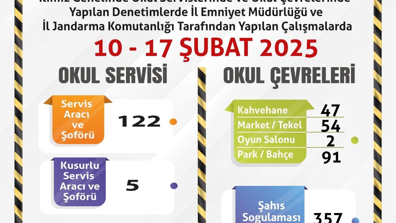 Edinilen bilgilere göre, İl Emniyet Müdürlüğü ve İl Jandarma Komutanlığı ekiplerince okul servisleri ile çevrelerine yönelik denetim yapıldı. Ekiplerin 10-17 Şubat tarihleri arasında gerçekleştirdiği çalışmalar sonucunda; 122 servis aracı ve şoförü kontrol edildi, 5 araç ve şoförün kusurlu olduğu belirlendi.