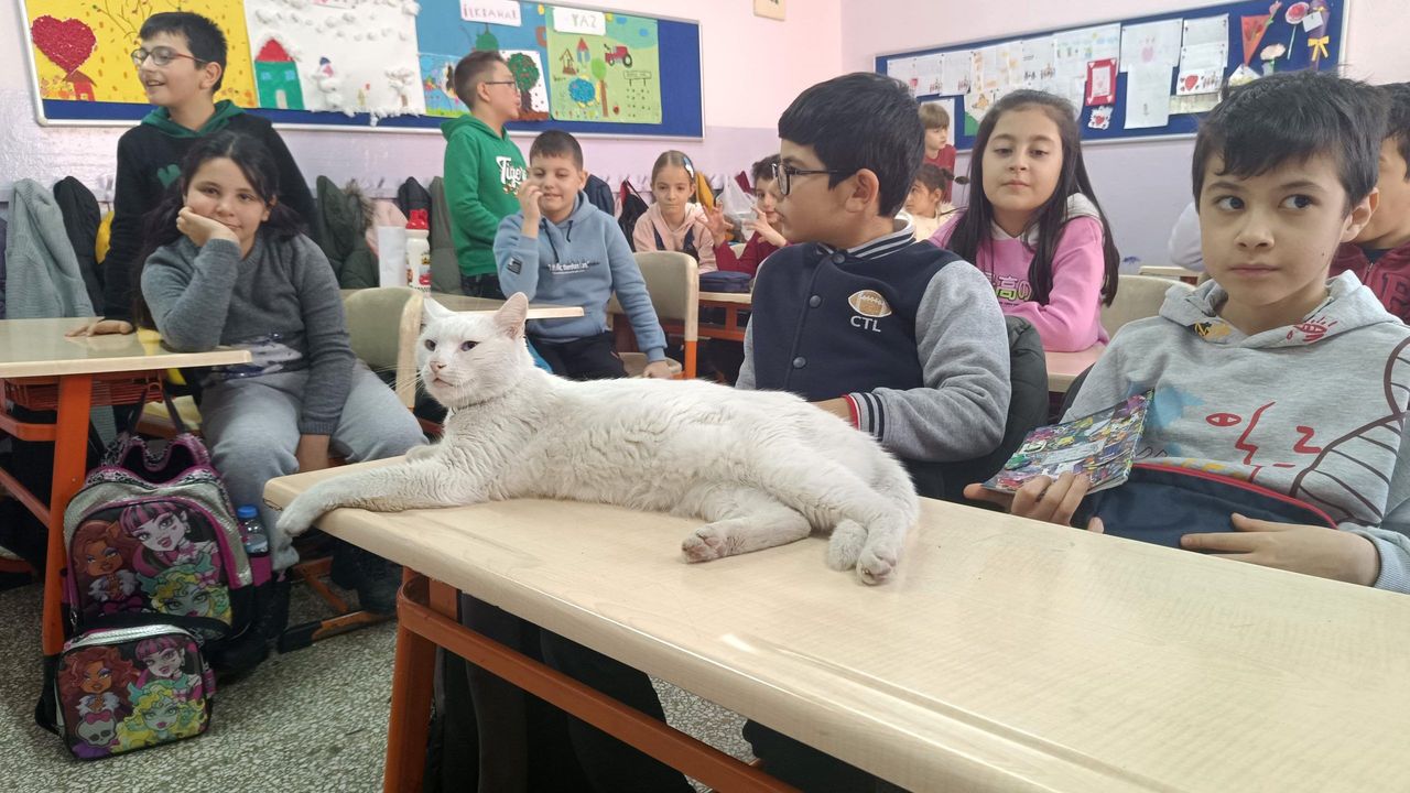 Eskişehir’deki bir ilkokulda yaşayan ve okul personeli tarafından beslenen 6 yaşındaki Çakıl isimli kedi, her gün öğrencilerle birlikte sınıflara giriyor ve ders dinliyor.