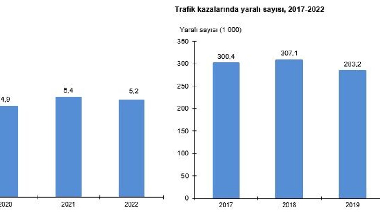 Türkiye İstatistik Kurumu (TÜİK) Karayolu Trafik Kaza İstatistikleri, 2022 verilerini yayınları. Buna göre ülke genelindeki karayolu ağında 2022 yılında toplam 1 milyon 232 bin 957 adet trafik kazası meydana geldi. Bu kazaların 1 milyon 35 bin 696 adedi maddi hasarlı, 197 bin 261 adedi ise ölümlü yaralanmalı trafik kazası. Yıl içerisinde meydana gelen ölümlü yaralanmalı trafik kazalarının yüzde 82,5'i yerleşim yeri içinde yüzde 17,5'i ise yerleşim yeri dışında meydana geldi.