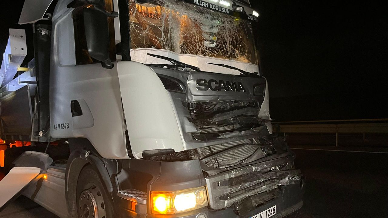 42 V 1248 plakalı tırın dorsesinde bulunan tonlarca ağırlıktaki demir direklerin öne yığıldığı ve kasaya zarar verdiği görüldü.
