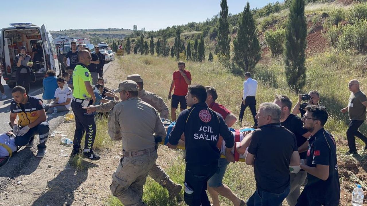 Eskişehir’e 14 kilometre kala D230 karayolunda sürücüsünün direksiyon hakimiyetini kaybettiği yolcu otobüsü boş araziye uçarken araçtaki 35 kişi yaralandı.