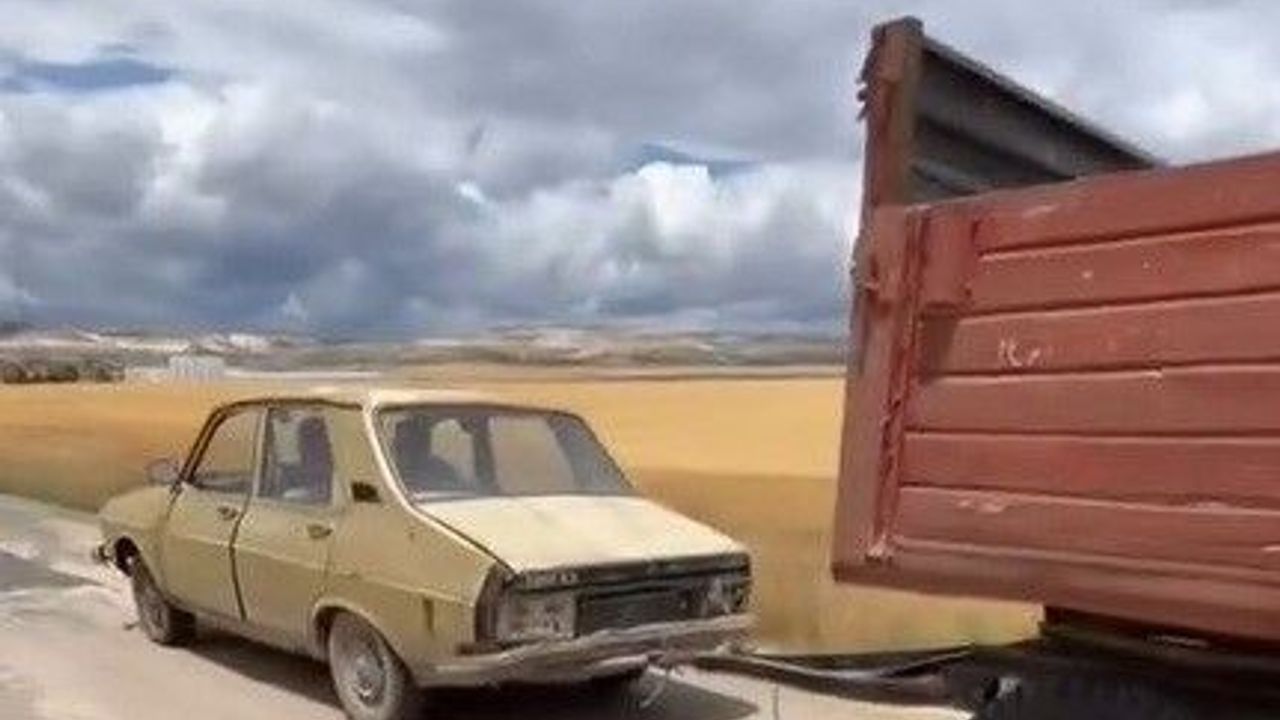 Alpu ilçesindeki bir kara yolunda, motosiklet sürücüsü tarafından kaydedilen görüntüler "bu kadarı da pes" dedirtti. Görüntülerde oldukça eski ve plakasız otomobilin ardına takılan traktör römorkunu çektiği göze çarpıyor. Yaklaşık 1,5 ton sadece boş ağırlığı bulunan ve herhangi bir sinyalizasyon sistemi olmadan gelişigüzel bağlanan römork, trafiği tehlikeye düşürdü. Araç kilometrelerce traktör römorkunu çekerek yoluna devam ederken, araçtakilerin rahatlığı hayrete düşürdü.