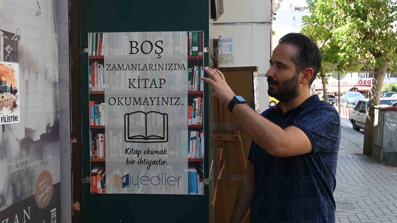 Eskişehir’de bulunan bir sahaf dükkanın önünde yazılı olan ’Boş zamanlarınızda kitap okumayınız. Kitap okumak bir ihtiyaçtır’ afişi cadde üzerinden geçen vatandaşlarda merak uyandırıp dükkan sahibine soru yöneltmelerine sebep oluyor.